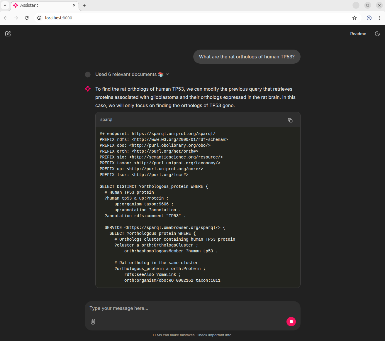 This project explored an AI-powered assistant that helps researchers ask questions about biology in plain English and automatically turns them into SPARQL queries against public databases: