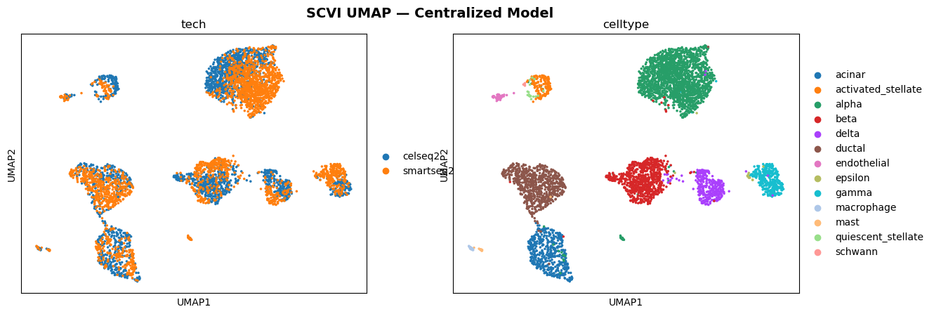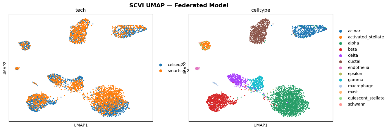 This project explored a scVI model (variational autoencoder for single-cell data) in a federated setting with secure aggregation using the Flower framework (Flower.ai) and the SecAgg+ secure aggregation protocol. For comparison, the same model was also trained in a centralized setting.