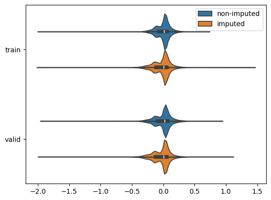 Figure: Model's output and the true gene expression values. Non-imputed data (blue): where the model reconstructed known values. Imputed data (orange): where the model predicted missing (masked) values.